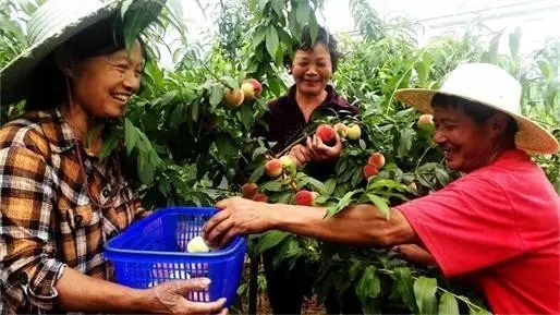 在业主黎国洪的带领下,笔者走进一个个大棚参观。黎国洪介绍说,胭脂脆桃是2015年底从成都双流区引种来的,今年才第3年,前期主要是培养高产树型,通过科学管理形成了高产的苗架,明年就可以大规模投产了,按照现在的长势,预计明年产量可达20多万斤。